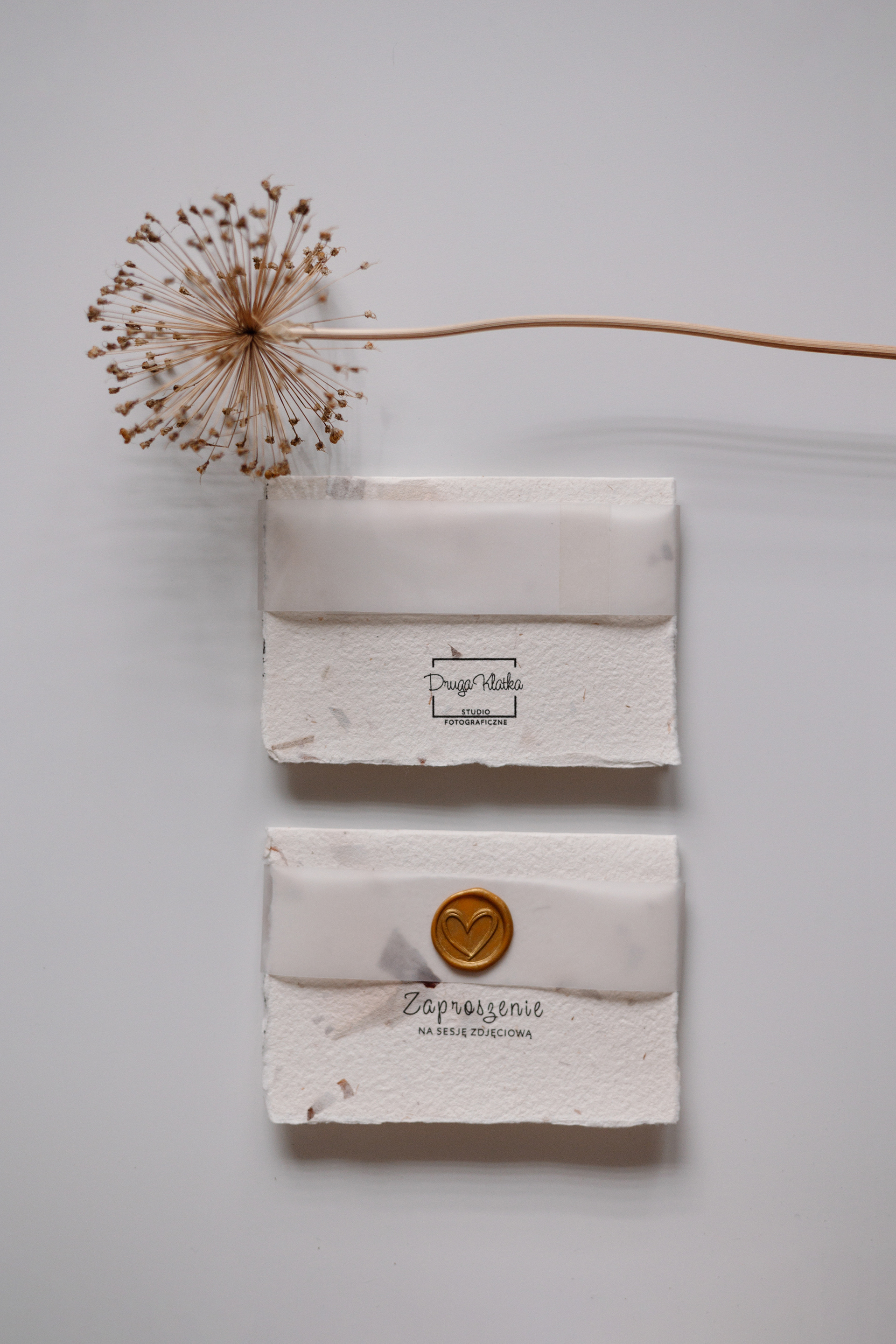 A z drugiej strony, zaproszenia powstały na papierze czerpanym, co oznacza że pod palcami możemy wyczuć kawałki zasuszonych roślin.